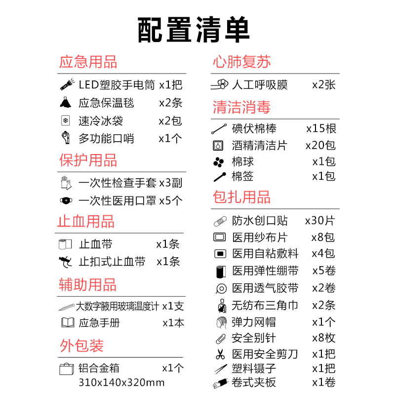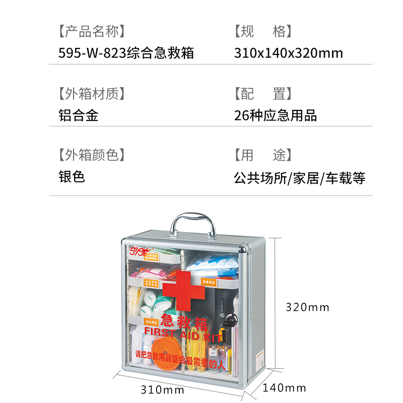 595综合急救箱,独特的箱体设计,适用于劳保、厂矿、公共场所、办公室、车间、学校、社区、健身房、实验室、建筑工地等人员密集的场所及防灾减灾等领域。