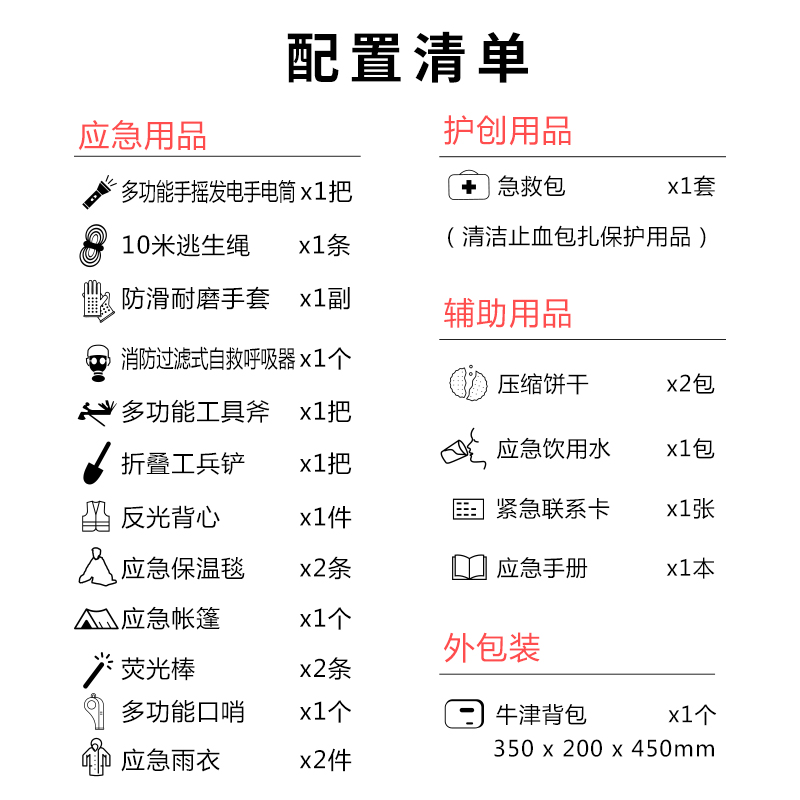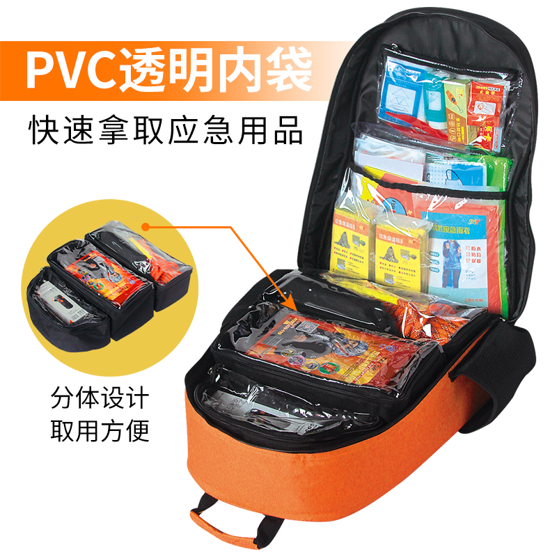 防灾应急包,适合突发灾害事故时恶劣环境下使用,配置全面、科学,满足从日常保健到灾难自救逃生的全面需求。