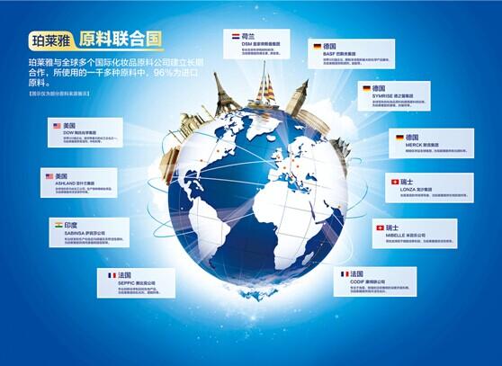 为从源头把握产品品质基础,珀莱雅与320多家全球知名化妆品原料公司建立了长期合作,在全球范围精选原料。珀莱雅研发负责人介绍,无论地球上哪里,只要那里的原料被发现是最优质、最安全的,珀莱雅就会将目光瞄准哪里。至今,企业所使用的一千多种原料中96%进口自欧洲、美国、瑞士、日韩、印度、巴西、以色列等国家和地区。全球领先的美国DOW陶氏化学、德国化工巨头BASF等均是珀莱雅的重要供应商。不惜成本,构建全球领先的“原料联合国”。