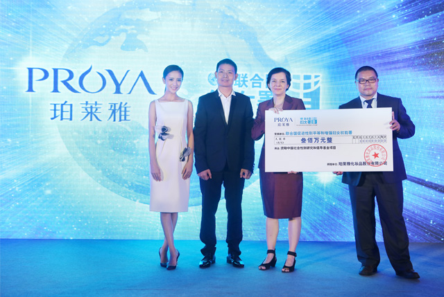 2013年9月12日,珀莱雅与联合国妇女署公益合作发布会,在杭州西子湖畔盛大举行。在近百家媒体及行业同仁的见证下,珀莱雅CEO方玉友先生与珀莱雅爱心大使佟丽娅亲手将首批300万公益款支票,交到联合国妇女署中国代表手中,至此作为国内化妆品领军企业的珀莱雅正式成为联合国妇女署中国首家企业合作伙伴。在发布会上,珀莱雅同时宣布启动“海阔天空·女性就业平等计划”,将通过持续投入帮助女性实现海阔天空的职业梦想。