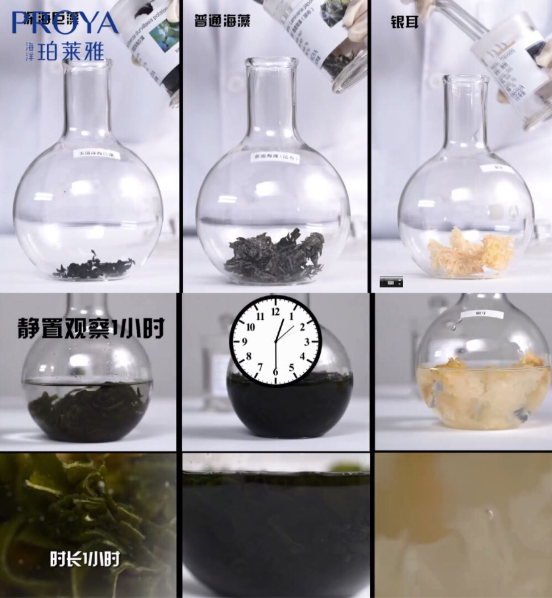 在吸水性测试中,大嘴博士选取同等质量的海洋原液的原料深海巨藻和普通海藻、银耳进行吸水力测试。实验发现深海巨藻可快速吸收自身重量13.3倍的水分,而普通海藻和银耳分别可吸收自身重量5倍和6倍的水。实验证明,深海巨藻具有超强吸水能力,为肌底提供保湿水库。